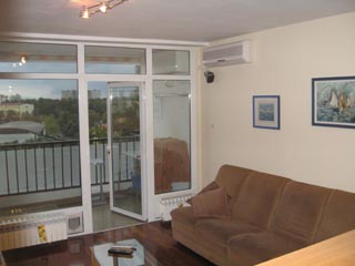 | Stan se nalazi na prvom katu zgrade. Ukupna površina 60 m2. Sastoji se od dvije spavaće sobe, dnevnog boravka sa kuhinjom, kupaone, hodnika i lođe. Puno staklenih površina daje puno prirodnog svjetla. Sva vanjska stolarija od aluminija. Centralno grijanje i topla voda iz toplane. U stanu je klima uređaj. Satelitska i obična TV i radio antena. Telefon, internet (ADSL), MaxTV. Stanu pripada i podrumska prostorija i jedna zajednička prostorija koju dijele sva tri stana na katu. U zgradi je lift. Ulazna vrata u zgradu se otvaraju parlafonom iz svakog stana. | ||
